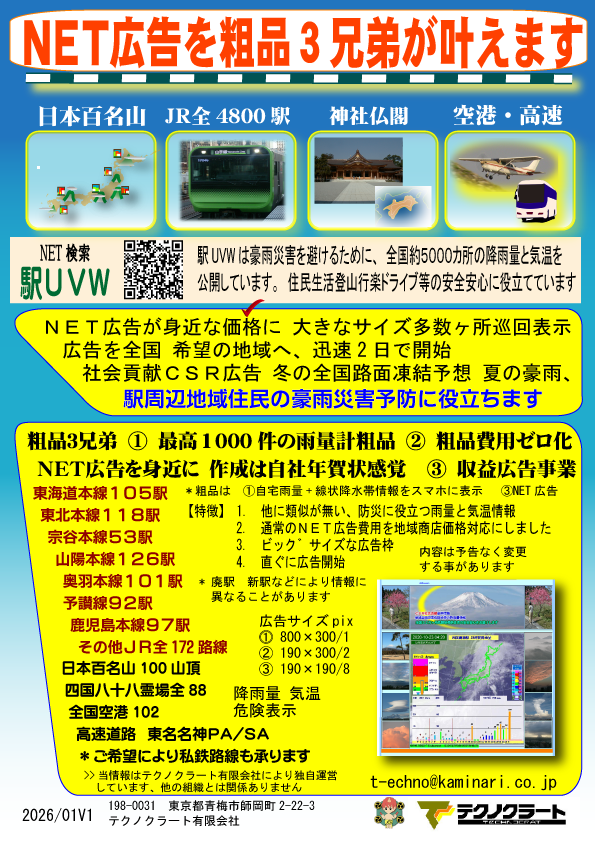 東京駅 新宿駅 渋谷駅 大阪環状線 天王寺 難波 など 全国JR駅4900ヶ所の雨量と気温情報番組に広告掲載 |